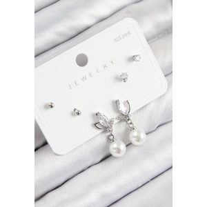 Pirinç Zirkon Taşlı İnci Melek Model Gümüş Renk 925 Ayar Gümüş Çivi Kadın Küpe Set
