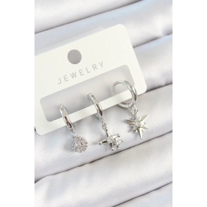 Pirinç Zirkon Taşlı Kutup Yıldızı Model Gümüş Renk 3'lü Çift Kadın Küpe Set
