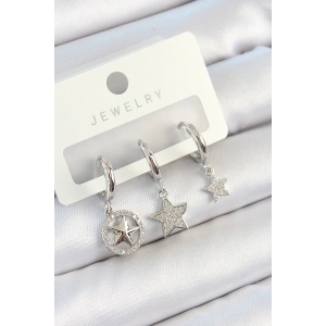 Pirinç Zirkon Taşlı Yıldız Ve Halka Model Gümüş Renk 3'lü Çift Kadın Küpe Set