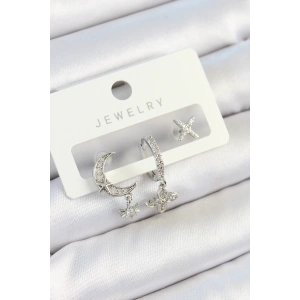 Pirinç Zirkon Taşlı Kelebek Ve Sallantılı Yıldız Model Gümüş Renk 3'lü Çift Kadın Küpe Set