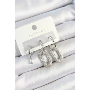 Pirinç Zirkon Taşlı Dikdörtgen Model Gümüş Renk 3'lü Çift Kadın Küpe Set