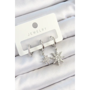 Pirinç Zirkon Taşlı Kutup Yıldızı Model Gümüş Renk 3'lü Çift Kadın Küpe Set