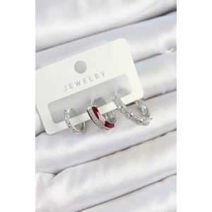 Pirinç Zirkon Taşlı Halka Model Gümüş Renk 3'lü Çift Kadın Küpe Set