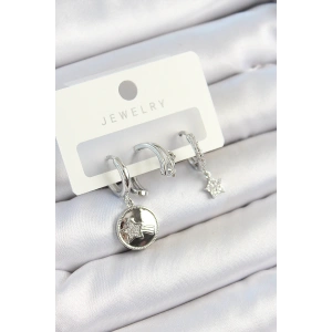Pirinç Zirkon Taşlı Sallantılı Yıldız Model Gümüş Renk 3'lü Çift Kadın Küpe Set
