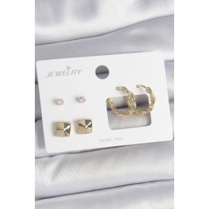 Pirinç Gold Renk Burgu Halka Model Zirkon Taşlı Kare Detay 3 Çift Kadın Küpe Seti
