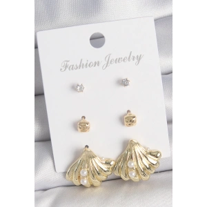 Pirinç Gold Renk Zirkon Taşlı İnci Detaylı Deniz Kabuğu Model 3 Çift Kadın Küpe Seti