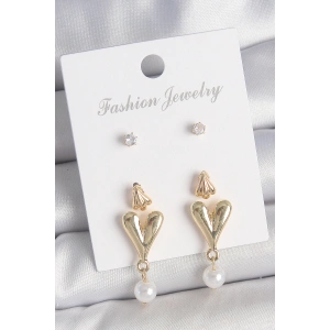 Pirinç Gold Renk Zirkon Taşlı İncili Sallantılı Kalp Model 3 Çift Kadın Küpe Seti
