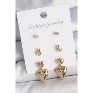Pirinç Gold Renk Zirkon Taşlı Sallantı Kalp Model Kadın 3 Çift Küpe Seti