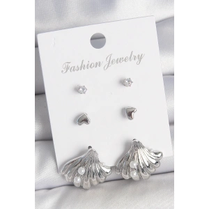 Pirinç Gümüş Renk Zirkon Taş Detaylı İnci Detaylı Deniz Kabuğu Model 3 Çift Kadın Küpe