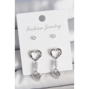 Pirinç Gümüş Renk Zirkon Taşlı Sallantılı Kalp Model Yarım Halka Detay 3 Çfit Kadın Küpe Seti