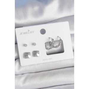 Pirinç Gümüş Renk Zirkon Taş Detay Sallantılı Kare Model 3 Çift Kadın Küpe Seti