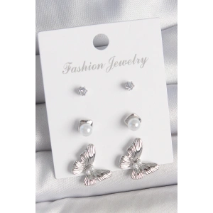 Pirinç Gümüş Renk Zirkon Taşlı İnci Detaylı Kelebek Model 3 Çift Kadın Küpe Seti