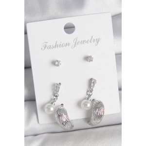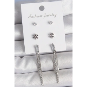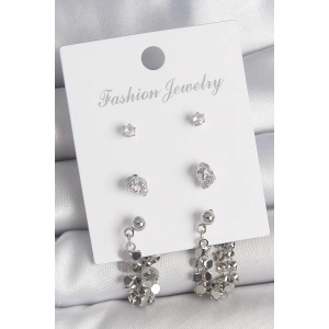 Pirinç Gümüş Renk Zirkon Taşlı Pullu Sallantılı Model 3 Çift Kadın Küpe Seti
