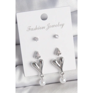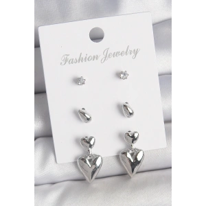 Pirinç Gümüş Renk Zirkon Taşlı Sallantılı Kalp Model 3 Çift Kadın Küpe Seti