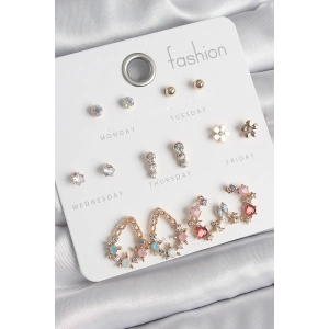 Pirinç Gold Renk Zirkon Taşlı Çiçek Figür İncili Halka Figür 7 Çift Kadın Küpe Seti