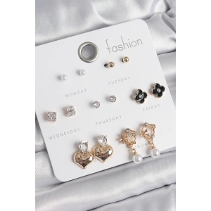 Pirinç Gold Renk Zirkon Taşlı Kalp Figür Siyah Yonca Detay 7 Çift Kadın Küpe Seti