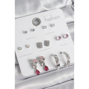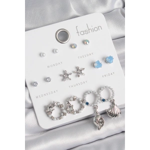 Pirinç Gümüş Renk İncli Zirkon Taşlı Halka Figür Yıldız Detay 7 Çift Kadın Küpe Seti
