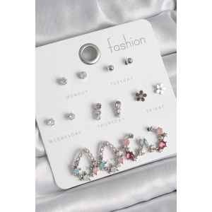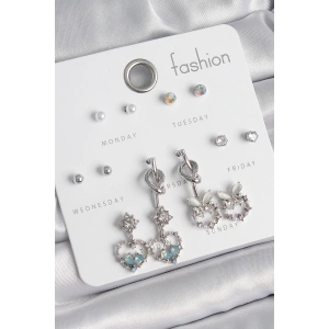 Pirinç Gümüş Renk Zirkon Taşlı Sallantılı Kalp Model Çiçek Detay 7 Çift Kadın Küpe Seti