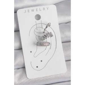 Pirinç Gümüş Renk Zirkon Taşlı 3'Lü Model Yaprak Figür Kadın Kıkırdak Küpe