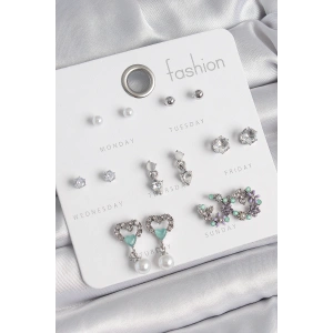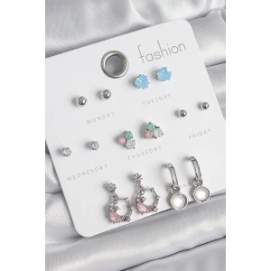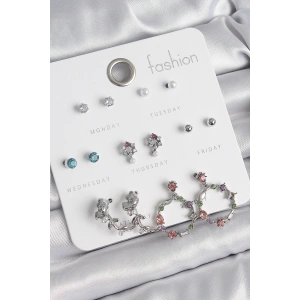 Pirinç Gümüş Renk Zirkon Taşlı Çiçek Figür İncili Halka Detay 7 Çift Kadın Küpe Seti