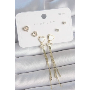 Pirinç Gold Renk Beyaz Mineli Sallantı Mineli Kalp Model Zirkon Taş Detaylı 925 Ayar Gümüş Çivi Kadın Küpe Seti