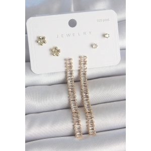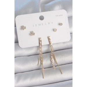 Pirinç Gold Renk Su Yolu Zirkon Taşlı Sallantı Model Çiçek Detay 925 Ayar Gümüş Çivi Kadın Küpe Seti