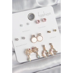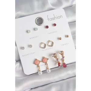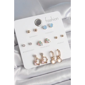 Pirinç Gold Renk Zirkon Taşlı Sallantı Damla Figür Beyaz Mine Detay 7 Çift Kadın Küpe Seti