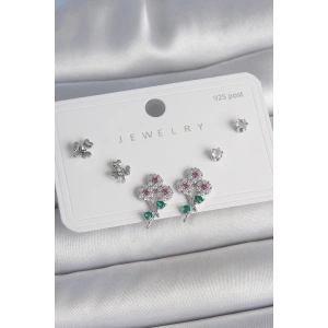 Pirinç Gümüş Renk Renkli Zirkon Taşlı Çiçek Model Yaprak Detay 925 Ayar Gümüş Çivi Kadın Küpe Seti