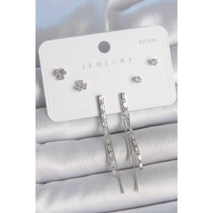 Pirinç Gümüş Renk Su Yolu Zirkon Taşlı Sallantı Model Çiçek Detay 925 Ayar Gümüş Çivi Kadın Küpe Seti