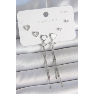 Pirinç Gümüş Sallantı Beyaz Mineli Kalp Model Zirkon Taşlı Kalp Detay 925 Ayar Gümüş Çivi Kadın Küpe Seti