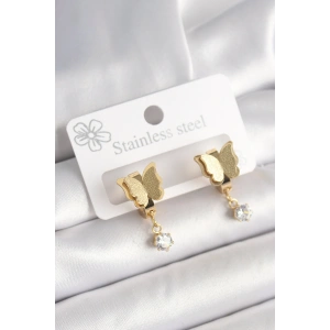 316L Çelik Gold Renk Sallantı Zirkon Taş Detaylı Simli Kelebek Model Kadın Küpe