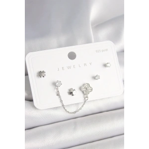 925 Ayar Gümüş Çivi Pirinç Gümüş Renk Zirkon Taşlı Yonca Model Sallantı Zincir Detay Kadın Küpe Seti