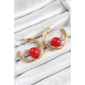 Pirinç Gold Renk Halka Model Kırmızı Boncuk Detay Kadın Küpe