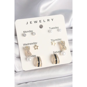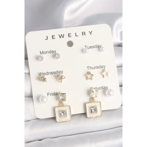 Pirinç Gold Renk Zirkon Taş Yıldız Detaylı İncili 7'Li Set Kadın Küpe Seti
