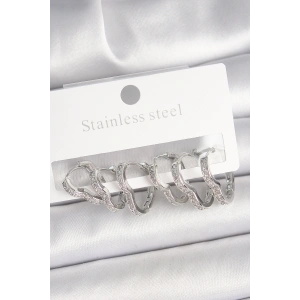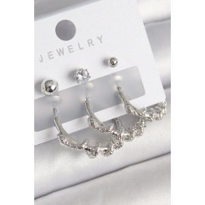 Pirinç Gümüş Renk Zirkon Taşlı 3 Çift Kalp Model Kadın Küpe