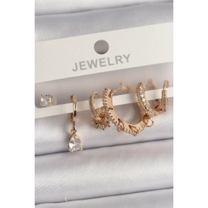 Pirinç Gold Renk Sallantı Zirkon Taşlı Halka Model Damla Zirkon Taş Detay Çoklu Kadın Küpe Seti