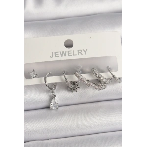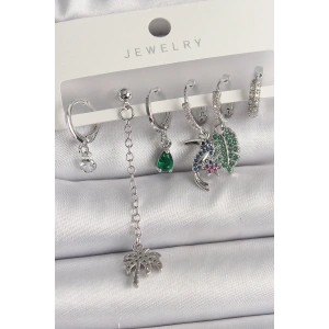 Pirinç Gümüş Renk Sallantı Zirkon Taşlı Ağaç Figür Çoklu Kadın Küpe Seti