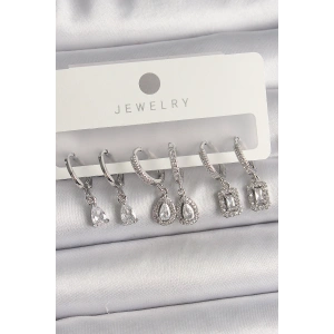 Pirinç Gümüş Renk Sallantı Zirkon Taşlı Damla Model Kadın Küpe Seti