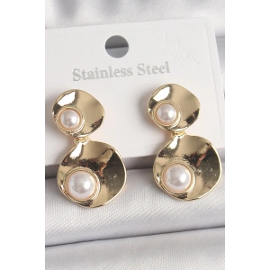 Pirinç Gold Renk Sallantı İnci Detaylı Daire Plaka Model Kadın Küpe