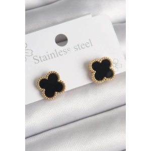 316L Çelik Gold Renk Siyah Yonca Model Kadın Küpe