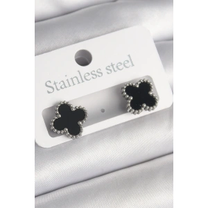 316L Çelik Gümüş Renk Siyah Yonca Model Kadın Küpe