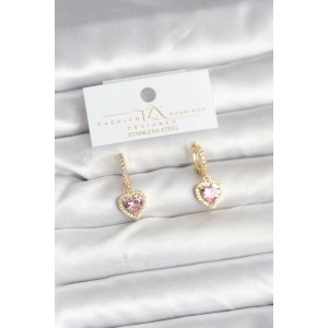 Pirinç Gold Pembe Renk Zirkon Taşlı Kalp Model Kadın Küpe