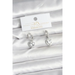 Pirinç Gümüş Renk Zirkon Taşlı Kalp Model Kadın Küpe