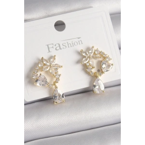 Pirinç Gold Renk Zirkon Taşlı Çiçek Model Sallantı Damla Detay Kadın Küpe