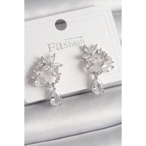 Pirinç Gümüş Renk Zirkon Taşlı Çiçek Model Sallantı Damla Detay Kadın Küpe
