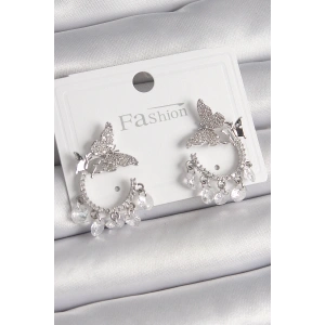 Pirinç Gümüş Renk Zirkon Taşlı Sallantı Detay Kelebek Model Kadın Küpe