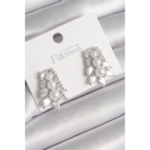 Pirinç Gümüş Renk Zirkon Taşlı Yaprak Model İnci Detay Kadın Küpe