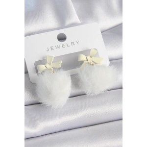 Beyaz Renk Kurdele Tüylü Ponpon Model Kadın Küpe