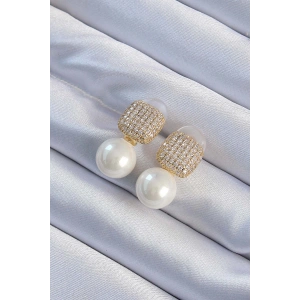 Pirinç Altın Renk Zirkon Taşlı Kare Model İnci Tasarım Kadın Küpe