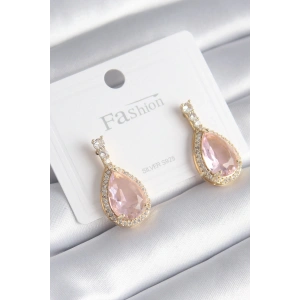 Pirinç Gold Renk Zirkon Taş Detay Damla Pembe Zirkon Taş Model Kadın Küpe